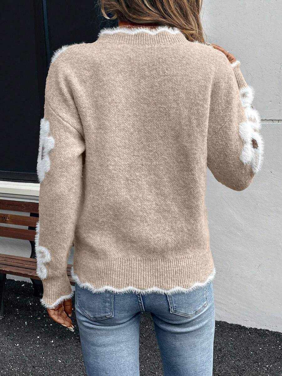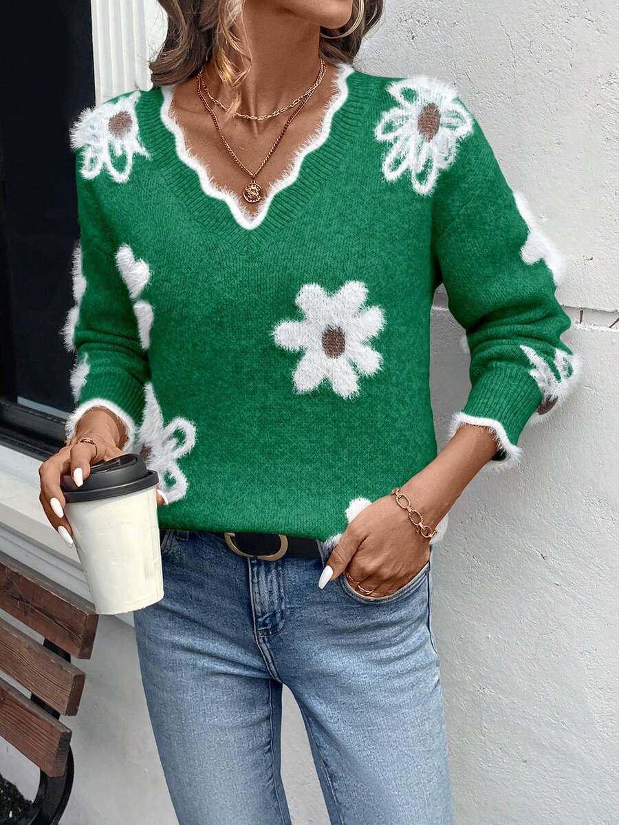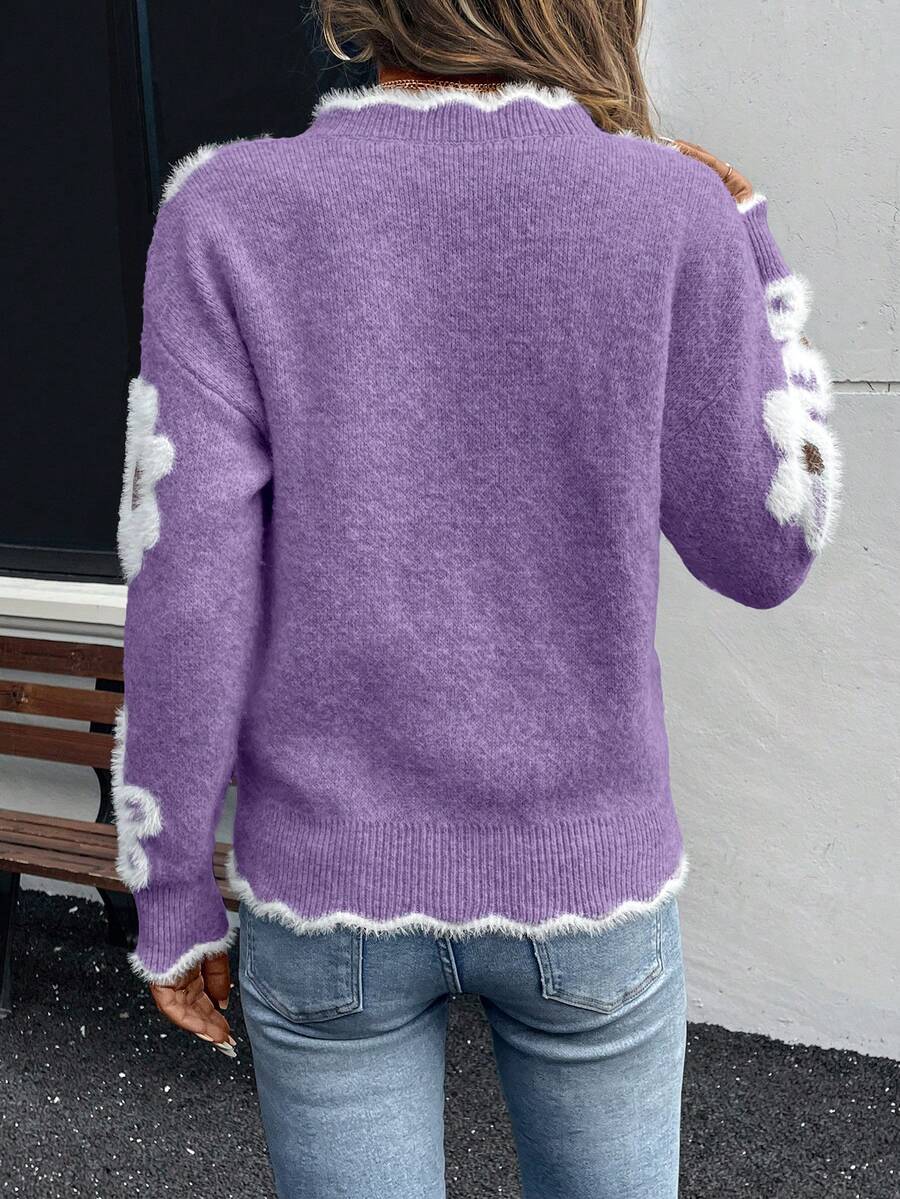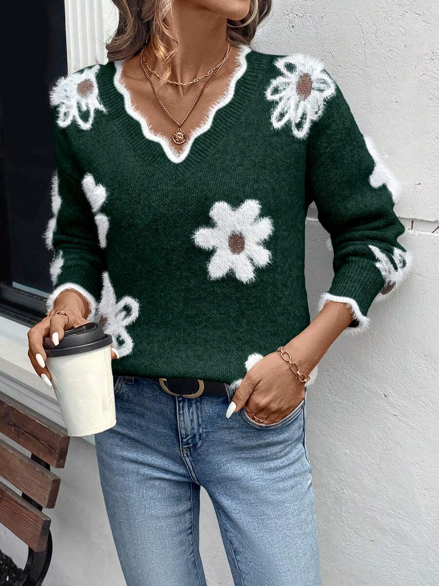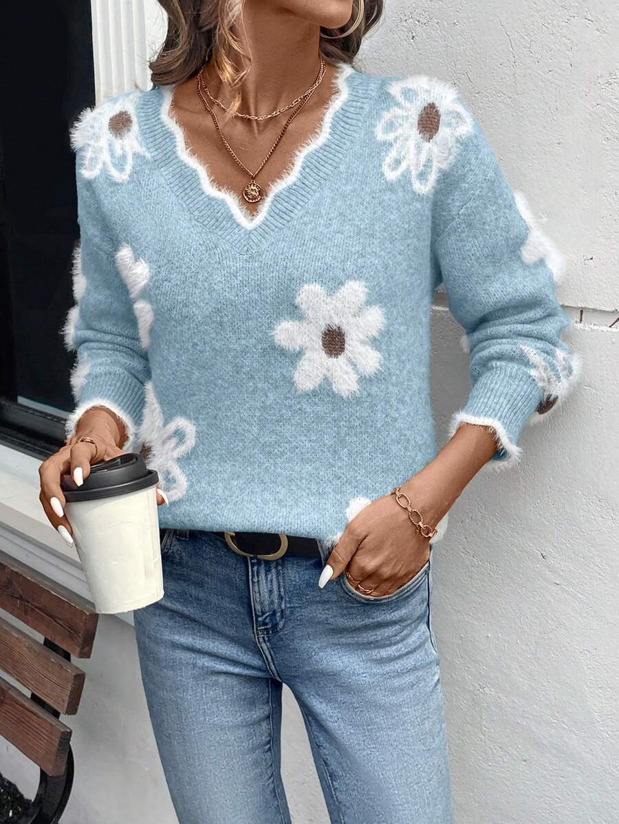 Denne bløde striktrøje kombinerer en flatterende V-udskæring med strikkede blomster, der giver et feminint og iøjnefaldende look. Perfekt til dage, hvor du vil føle dig godt tilpas uden at gå på kompromis med din stil. Brug Fleur™ afslappet med jeans eller mere elegant med en nederdel – uanset hvad, stråler du.