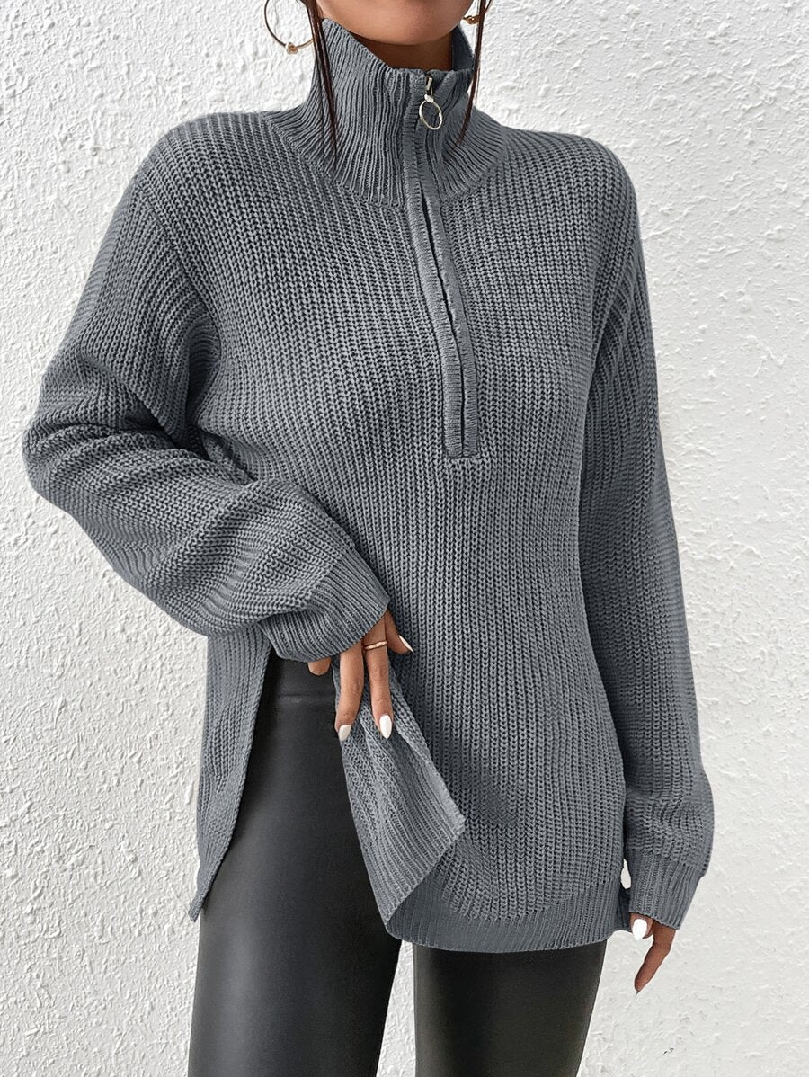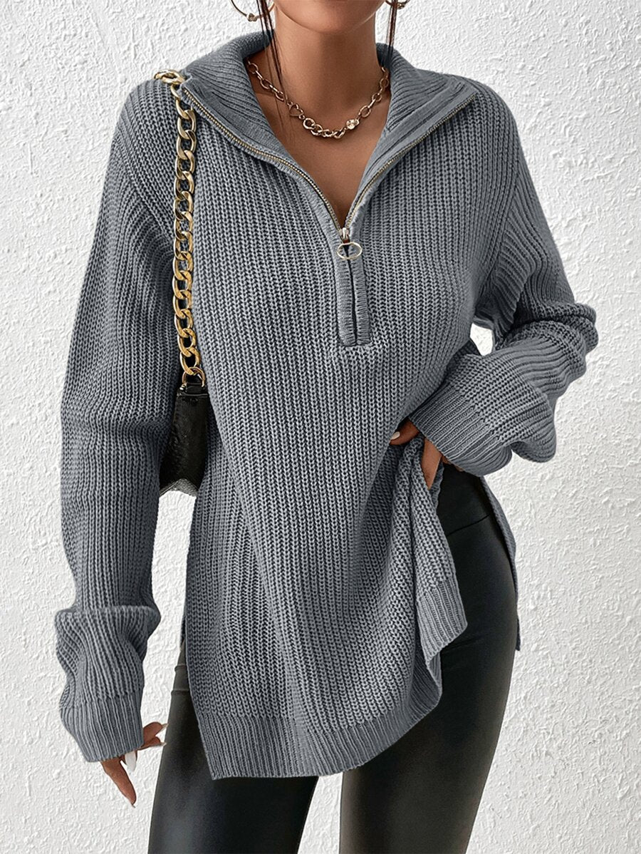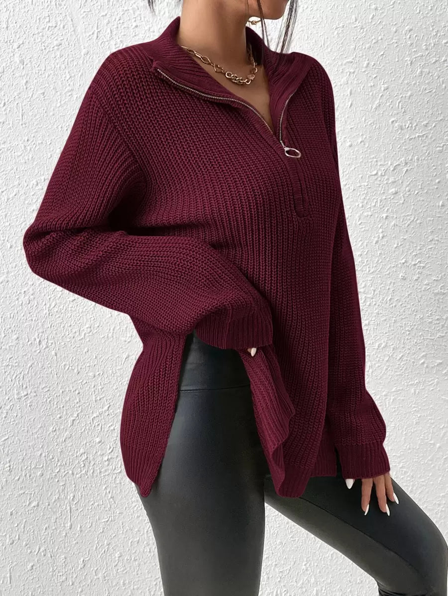 Nora™ er essensen af afslappet elegance. Den grove ribstrik, halve lynlås og de løse skuldre giver trøjen et moderne og ubesværet udtryk. Perfekt til kvinder, der vil kombinere komfort med stil – hvad enten det er til en hyggelig dag derhjemme eller en casual dag ude.