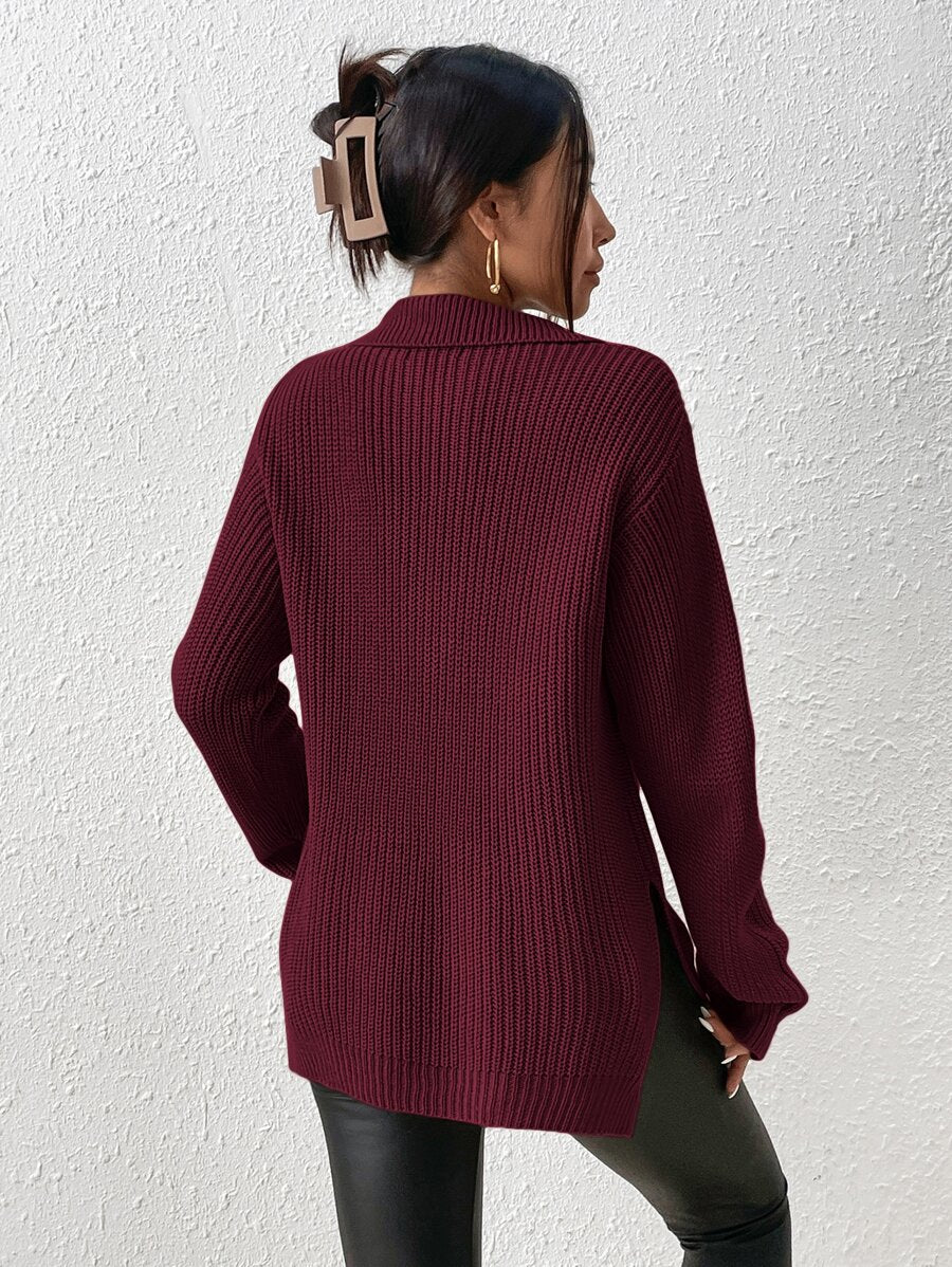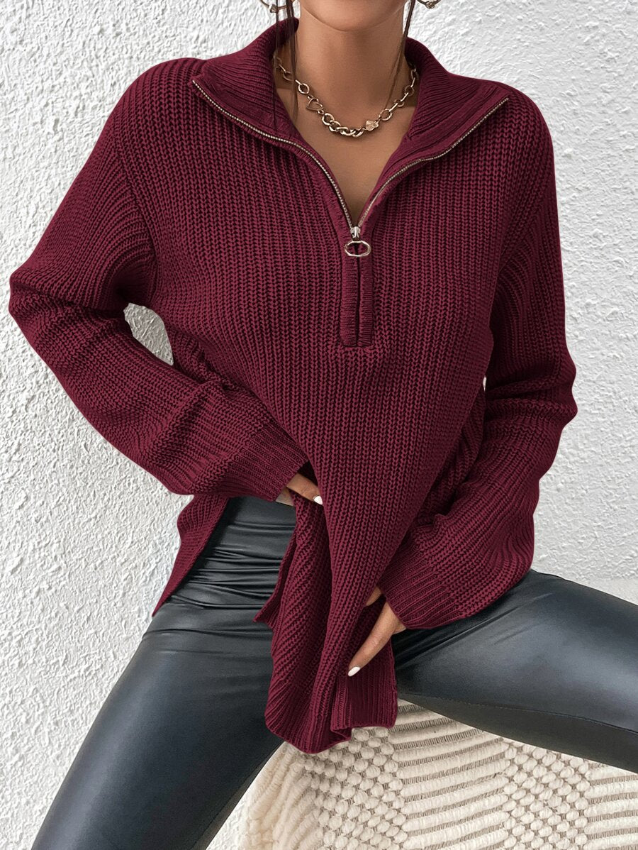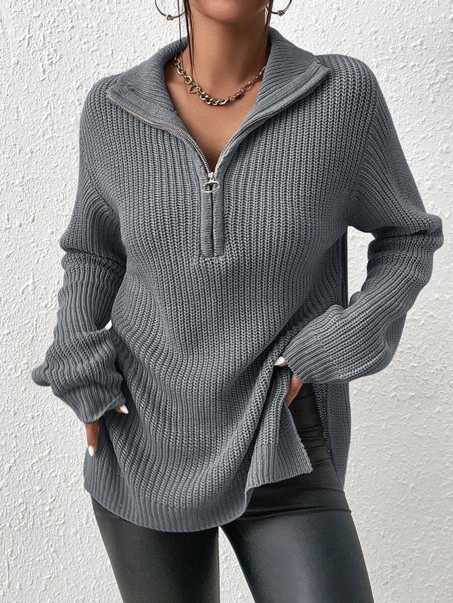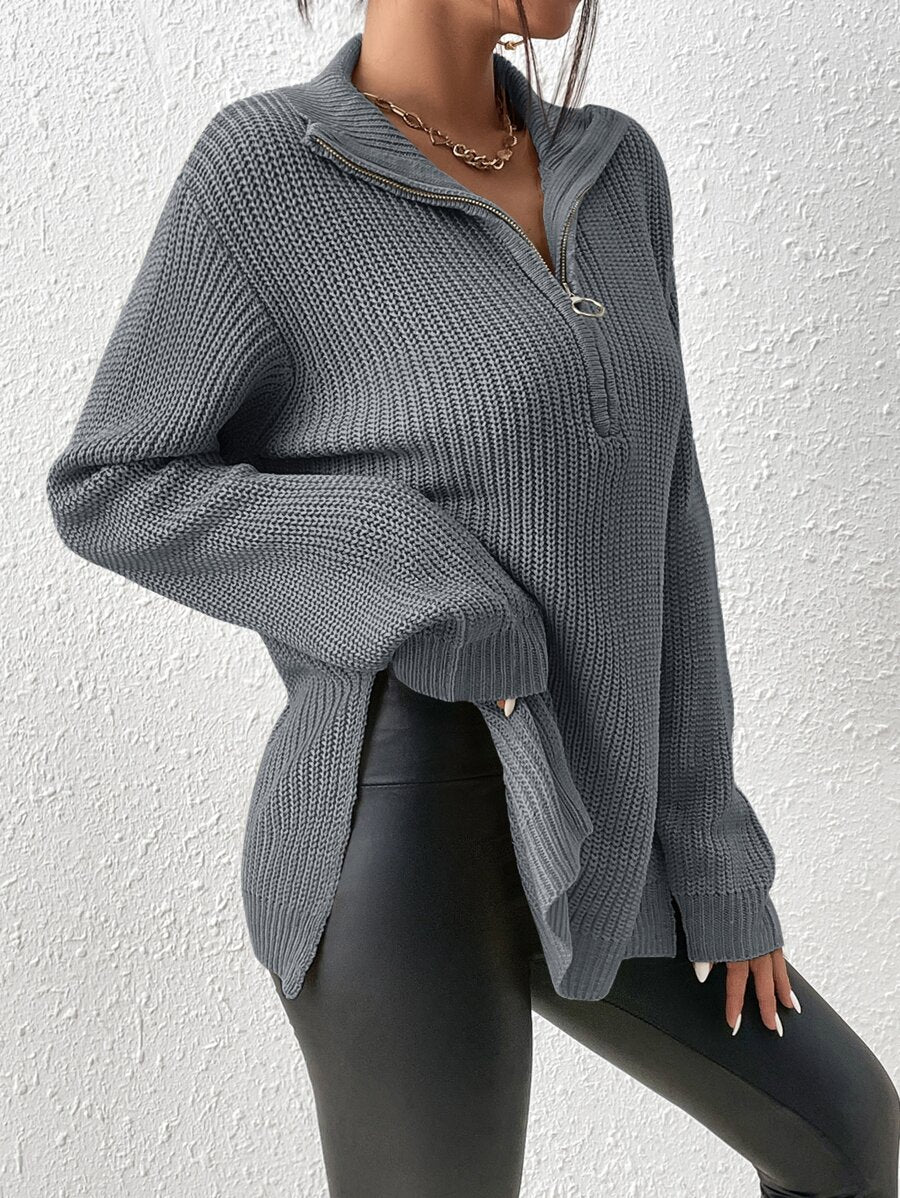 Nora™ er essensen af afslappet elegance. Den grove ribstrik, halve lynlås og de løse skuldre giver trøjen et moderne og ubesværet udtryk. Perfekt til kvinder, der vil kombinere komfort med stil – hvad enten det er til en hyggelig dag derhjemme eller en casual dag ude.