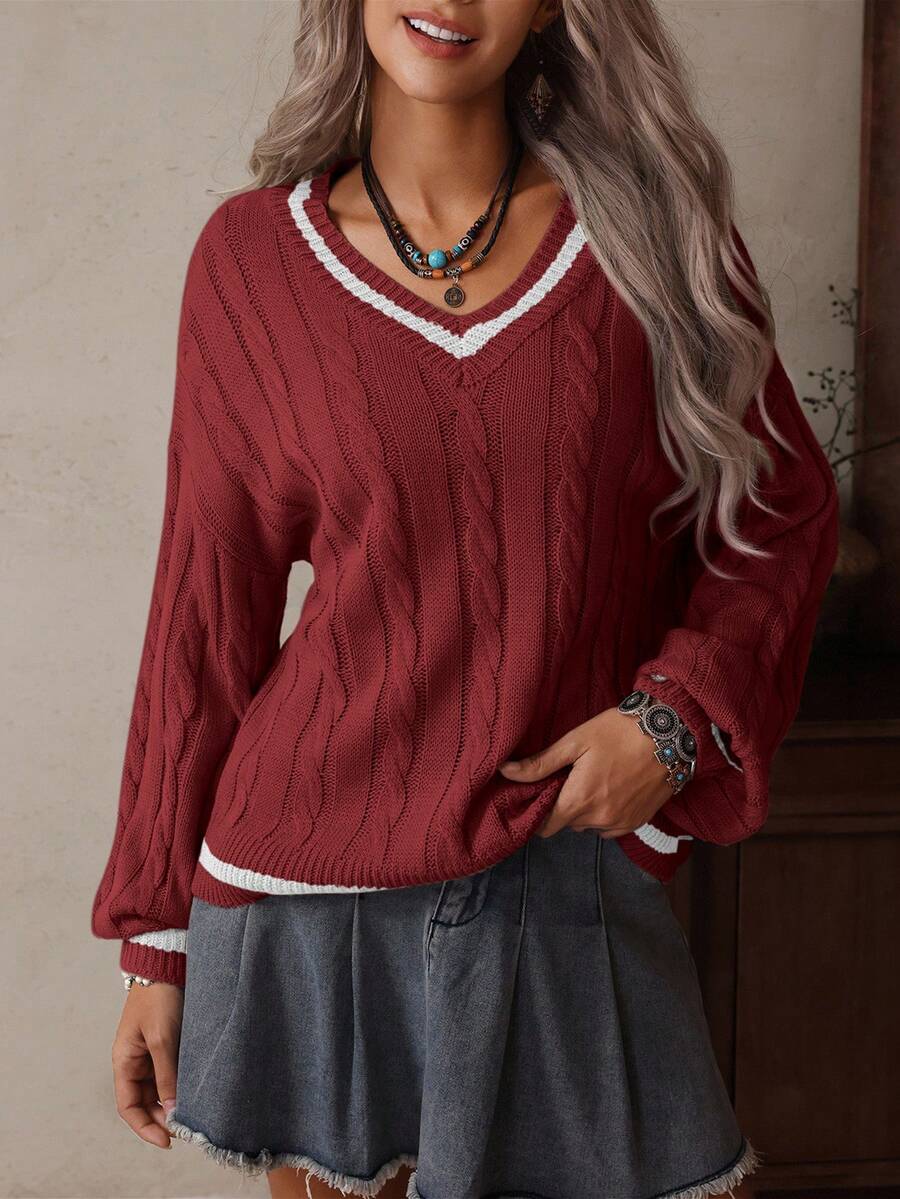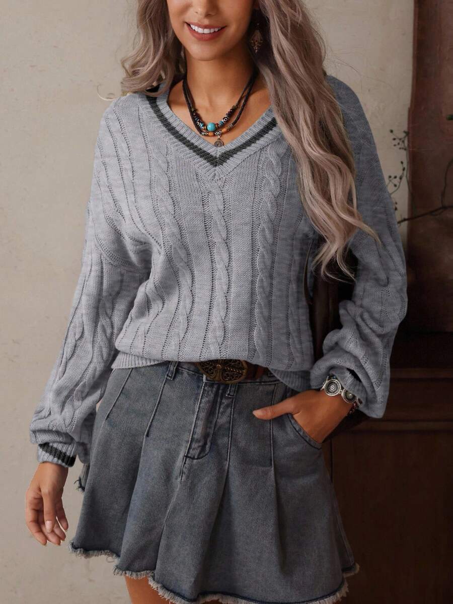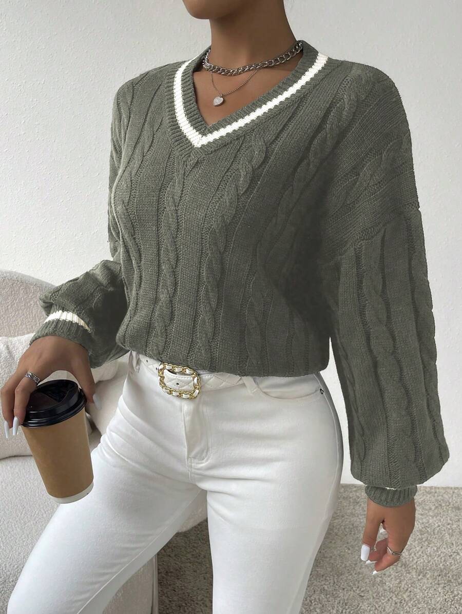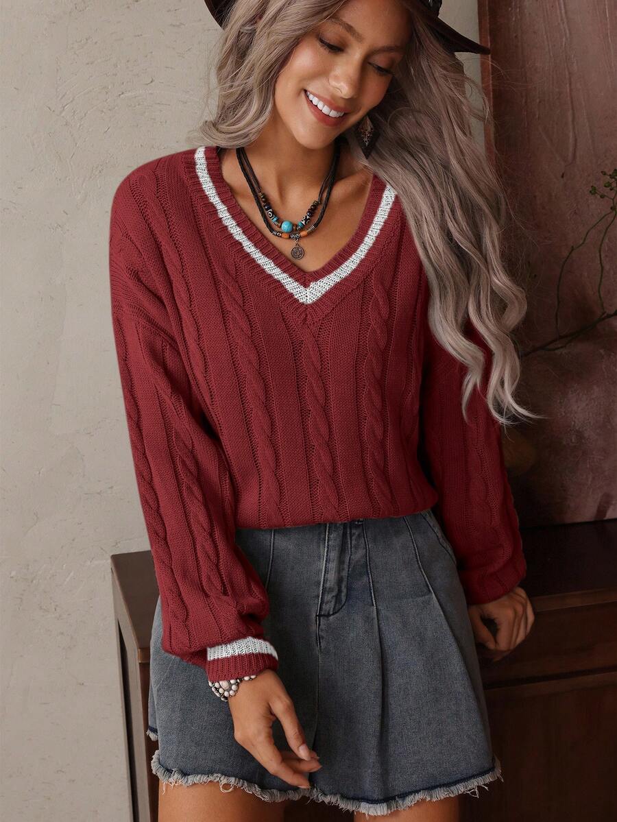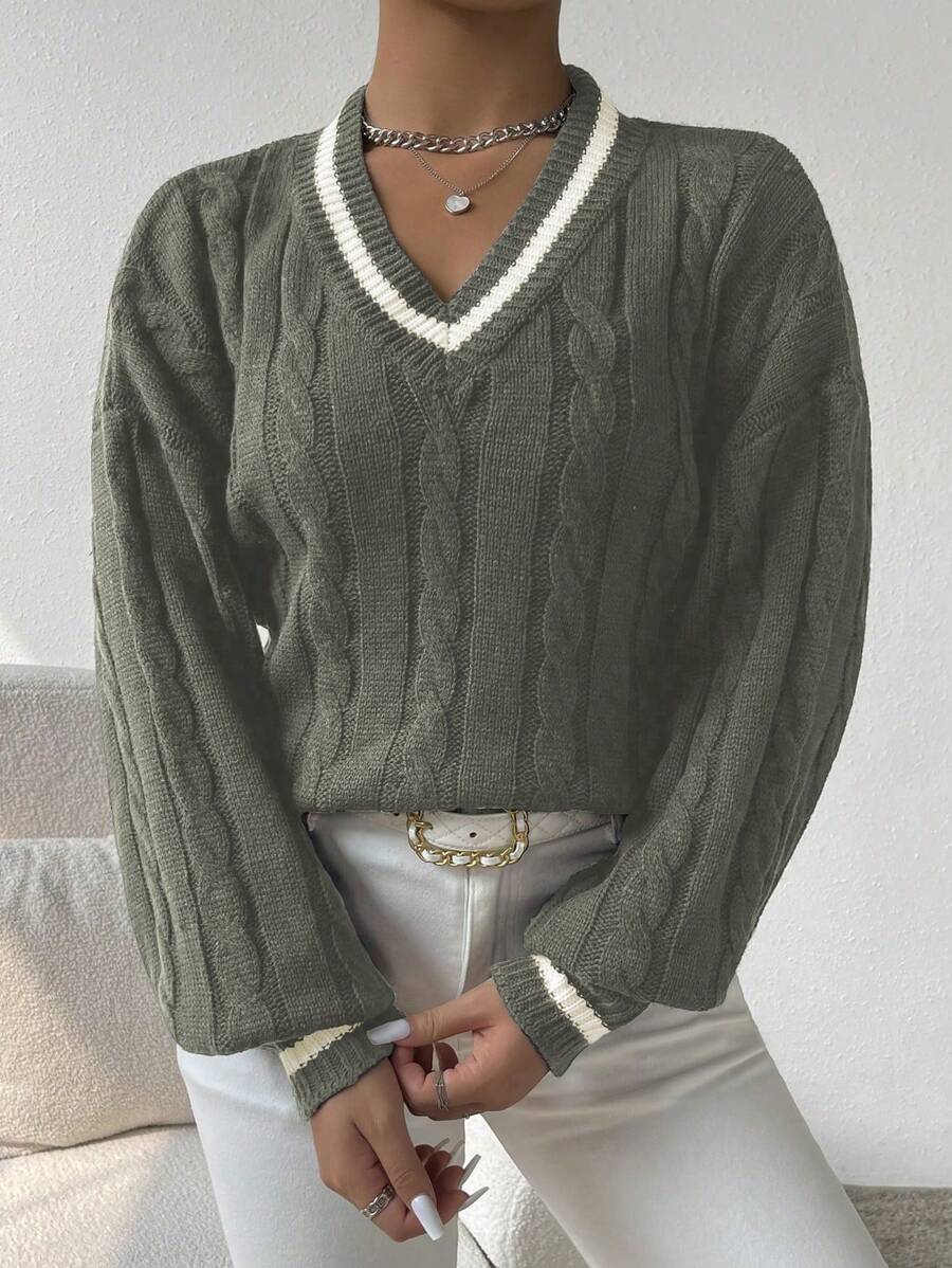 Claire™ | Preppy Kabelstrik Med Dyb V-Hals